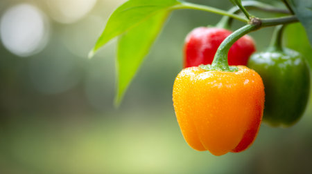 Vibrant background of fresh green, red, and yellow bell peppers, ideal for vegetables backdrop