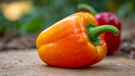 A vibrant orange bell pepper sits on a wooden surface with a red pepper in the background.