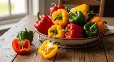 Colorful bell peppers arrangement red yellow green fresh vegetables. Placed on kitchen table showcasing healthy eating vibrant colors delicious taste. Ideal cooking ingredient raw snack. AI Generative AI generated
