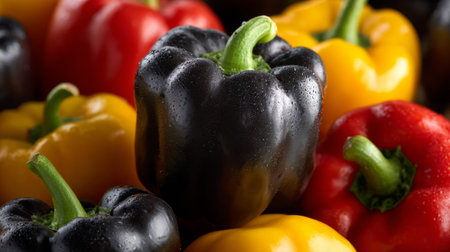 This image features a vibrant assortment of fresh bell peppers, including black, red, and yellow varieties, glistening with droplets of water.