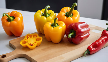 Yellow orange and red capsicum with chopping board on table