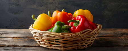 A vibrant basket filled with fresh bell peppers in various colors, perfect for healthy food photography and vibrant meal presentations.