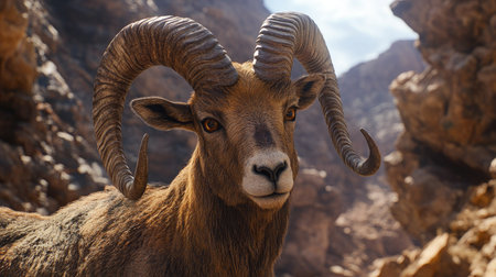Majestic goat with curved horns poses against a rocky background in a natural habitat