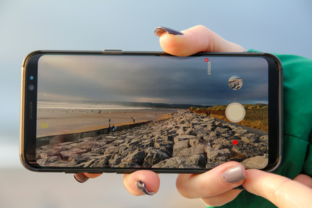 A woman take a photo of the sea on smartphone, female travels along the coast in the cold season. Outdoor. POV. Close up