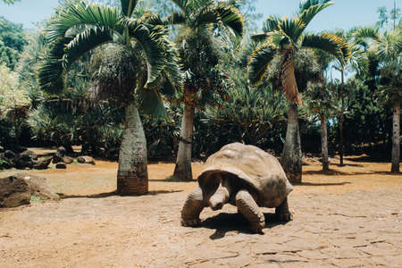 giant tortoises Dipsochelys gigantea in a tropical Park on the island of Mauritius in the Indian ocean.