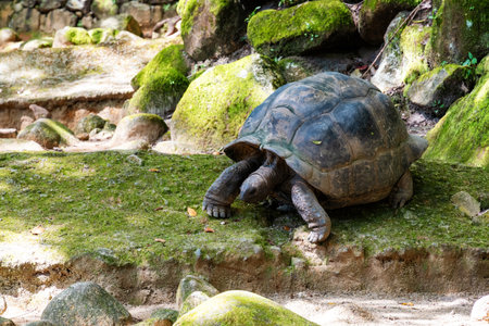 A majestic Aldabra giant tortoise slowly moves across moss-covered rocks and soil. Wild animals in nature