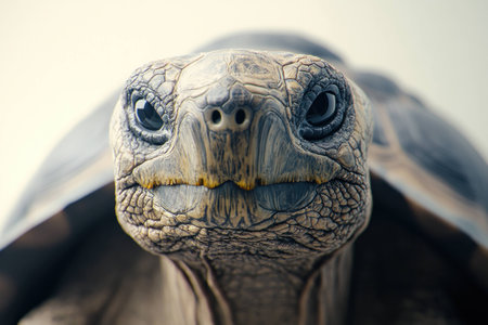 Portrait of a tortoise showcasing intricate textures and details, highlighting its unique features and serene expression against a soft, neutral background