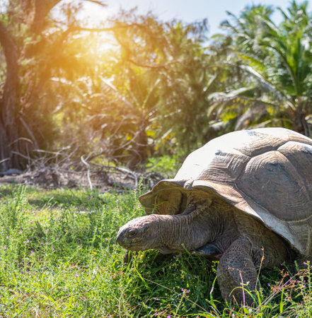 A massive Aldabra giant tortoise slowly walking and grazing on vibrant green grass in a tropical wildlife park