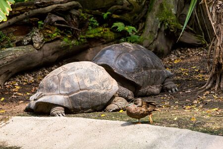 Couple of Aldabra giant tortoises endemic species - one of the largest tortoises in the world in zoo Nature park on Mauritius island. Huge reptiles portrait. Exotic animals, love and traveling concept