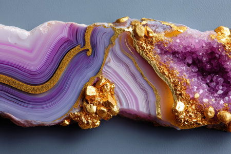 Close-up of a semiprecious agate slab with polished surface, purple and lilac crystal bands, and natural gold veins, ideal for luxury stone design inspiration.