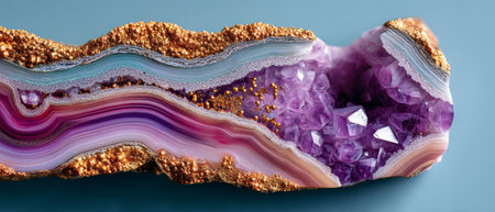 Elegant slice of agate geode with gold edges and rich amethyst and quartz crystal layers, macro view showing deep color gradients and mineral textures.