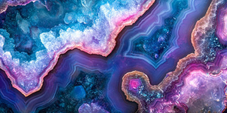 Intricate layers of agate stone display a vivid spectrum of purple, pink, and blue hues, showing shimmering crystals and smooth surfaces that highlight natural artistry.