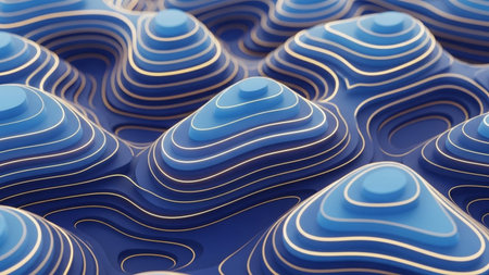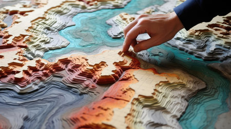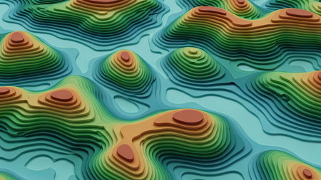 An abstract illustration presents a topographic map with layered contours and varied colors. The image showcases a three-dimensional effect, using shades of green, orange, and brown, suggesting a landscape. This art piece could be suitable for design projects, educational materials, or presentations related to geography and cartography.