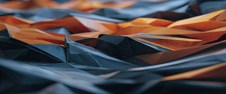 This abstract artwork features a textured, geometric composition with a shallow depth of field. The image is dominated by triangular and polygonal shapes in shades of orange, and blue. The visual is likely suitable for a range of commercial applications including websites, posters and design projects.
