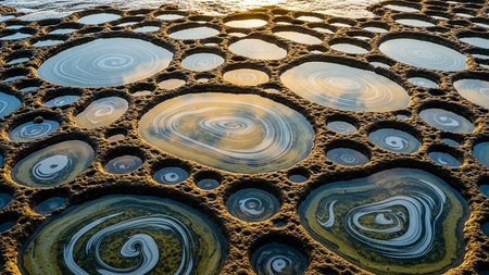 Weathered showing close-up aerial view of a unique natural rock formation with numerous circular tide pools filled with swirling water reflecting the golden...