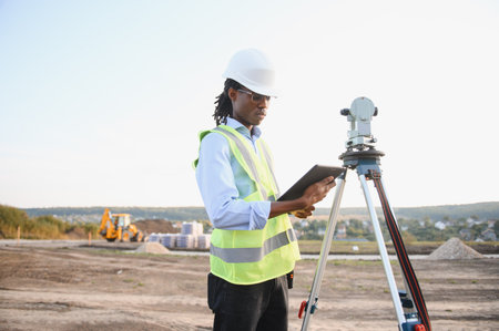 African american engineer using a digital tablet and surveying equipment at a construction site, ensuring accurate land measurements