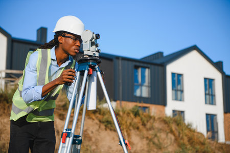 African american surveyor using a theodolite for land measurement and planning on an outdoor building site