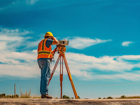 Surveyor wearing hard hat and safety vest, looking through a theodolite, performing land measurement and construction planning outdoors
