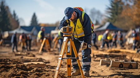 Professional engineer or surveyor measuring and leveling on a construction site, ensuring accuracy in building development