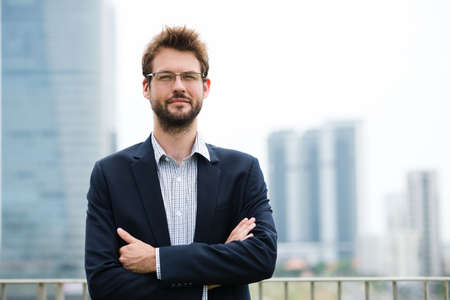 Outdoor male portrait. Man in blue t-shirt posing near American city. Happy business man posing outside. Businessman. Business man in t-shirt. American owner, casual businessman.