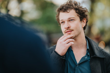 Young professional man outdoors with thoughtful expression, casual business vibe in a city park