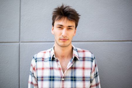 Portrait of a handsome young man in an urban context. Men's beauty, fashion.