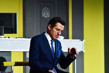Serious young handsome man have a conversation with colleagues during meeting on black background, with wireless earphones. Caucasian businessman using wireless headphones in business conference.