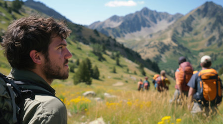 A group of travelers hiking up a beautiful mountain, surrounded by natural landscapes filled with plants, grasslands, and hills, under a vast sky. AIG41