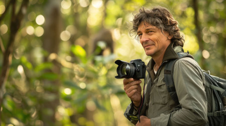 The picture of the professional photographer shooting the picture of nature with the camera and beautiful forest under the sun light, the cameraman require photography knowledge and creative. AIG43.