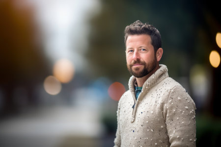 Businessman portrait outdoor. Smiling mature business man. Autumn portrait. Businessman in autumn park. Caucasian man has business casual style. Mature man face portrait. Copy space