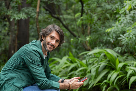 View of a young man with smartphone at daytime sitting down on a bench in a green park in the city. High quality photo.