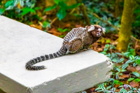 Marmoset Monkey in green tropical jungle rainforest on fence bench in Rio de Janeiro State of Rio de Janeiro Brazil.