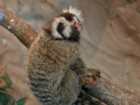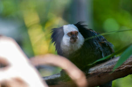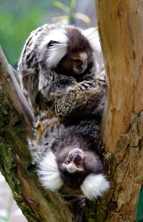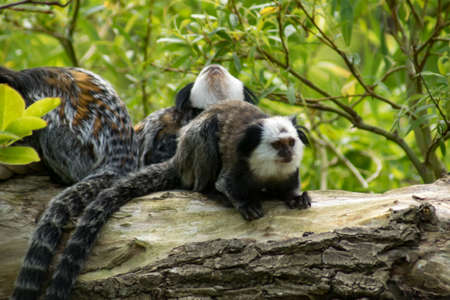 Monkeys black-tufted marmoset or titi de penachos negros sitting on branch tree in zoo