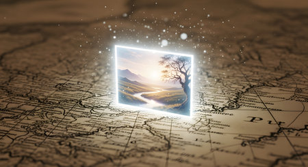 A conceptual and magical image where a glowing portal or screen levitates above a vintage map. Inside the glowing frame, the flat map comes to life as a vibrant, three-dimensional landscape with a winding river and a beautiful tree. The image symbolizes bringing ideas to life, imagination, virtual travel, or discovering new worlds.