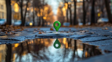 A vibrant green location pin standing in a city puddle, reflecting urban buildings with a hint of greenery. A thought-provoking visual capturing urban dynamics.