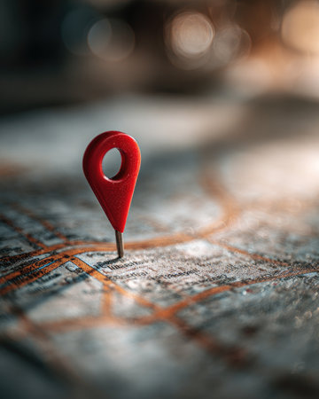 A red map marker is placed on a detailed map, highlighting a specific location. The composition features a shallow depth of field, emphasizing the marker and its surroundings. The map displays detailed lines and colors, while the lighting creates shadows and highlights, suitable for commercial applications.