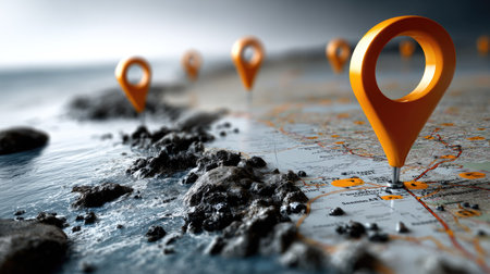 This image features vibrant orange location pins placed on a detailed map along a coastline, representing travel, navigation, and exploration.