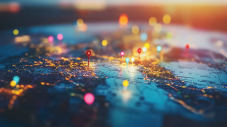 Stunning map view with colorful location pins and soothing lights, creating a vibrant and inviting atmosphere. Ideal for travel and exploration themes.