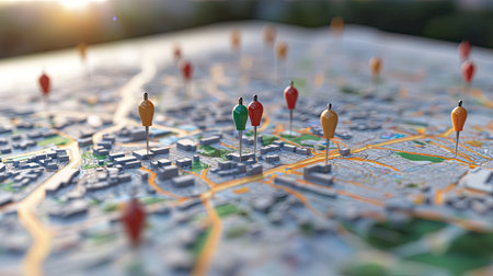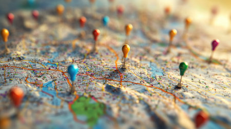 A detailed map with vibrant pinpoint markers showing specific locations in colorful and detailed accuracy