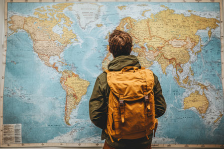 Adventurous young tourist studies a world map while preparing for travel, symbolizing exploration, adventure and global journey planning.