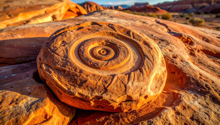The golden light of sunset illuminates a rare and beautiful spiral concretion in the red rock desert.