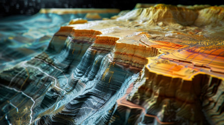 This abstract image showcases a stunning composition of vibrant earthy tones and intricate textures, resembling layered natural formations in a colorful landscape.