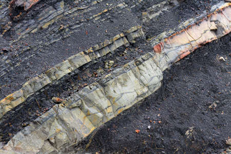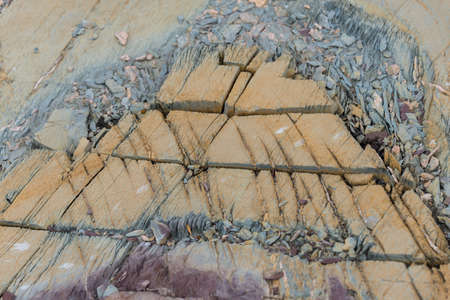 Rock Erosion texture over the time. Geographical Metamorphic rock with faults undergoing transformation from Igneous Rock to Sedimentary Rock, and will further erode to soil.