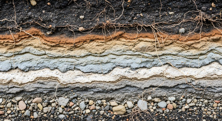 A detailed cross-section of the earth, revealing distinct horizontal layers of soil and sediment. The different colors and textures, from dark topsoil with fine roots to layers of clay, sand, and gravel, illustrate geology and soil science.