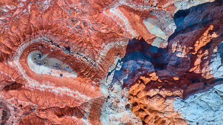 Aerial Red and Orange Striated Desert Rocks with Swirling Patterns and Cliffs