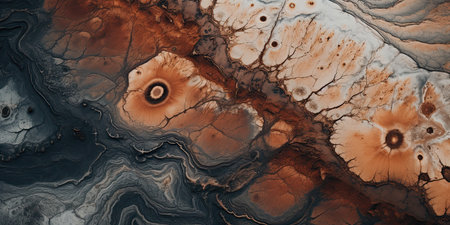 This abstract image showcases a stunning composition of vibrant earthy tones and intricate textures, resembling layered natural formations in a colorful landscape.