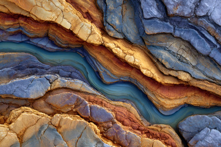 Colorful abstract rock layers displaying an intricate pattern of geological strata with a flowing river