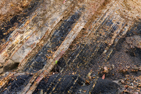Close-up of rocky rock on a slice of a mountain. The concept of multi-million evolution and change of time periods. Archaeological concept. Background concept