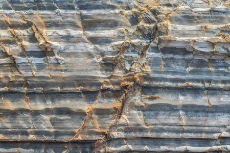 Rock texture background. Closeup of the sedimentary rock in the cliff at the seaside