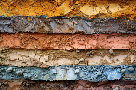 textures of various clay layers underground in clay quarry after geological study of the soil. colored layers of clay and stone in section of the earth, different rock formations and soil layers.